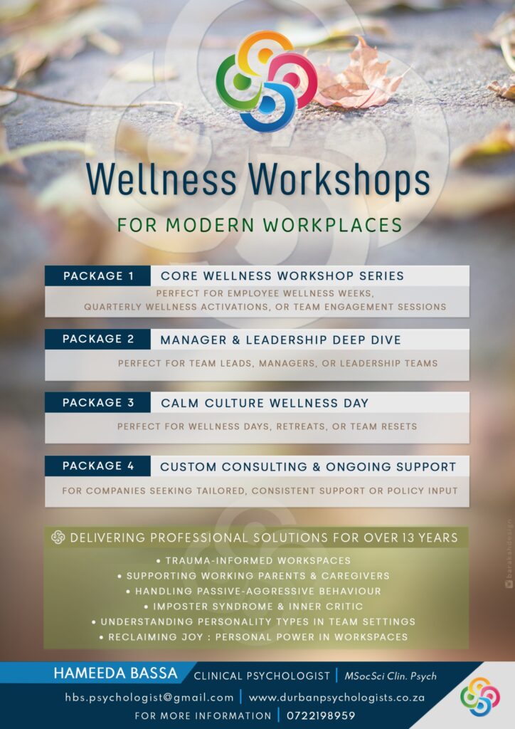 I am the Secretary General of the Durban Practicing Psychologist’s Group (DPPG) and I run peer supervision groups for other health care professionals. I also provide expert opinion for national magazines and radio such as You Magazine and Al-Ansaar Radio. I have also published academic literature and have been accepted to present at national psychological conferences, such as PsySSA (Psychological Society of South Africa) and the WCP (World Congress of Psychotherapy)